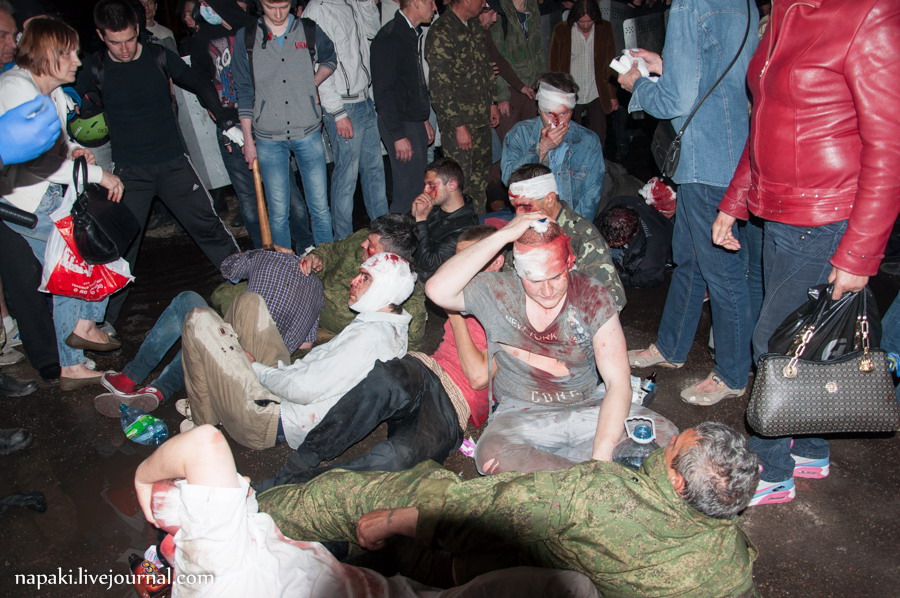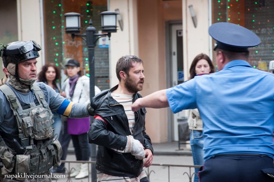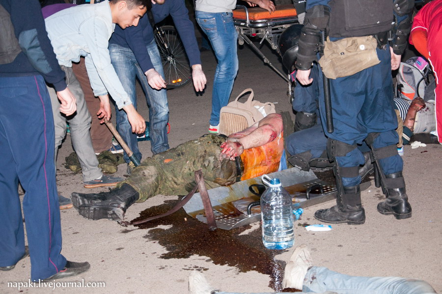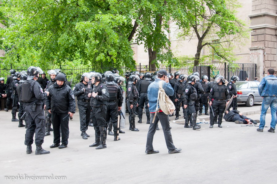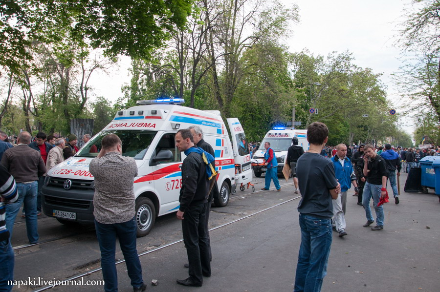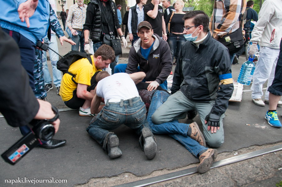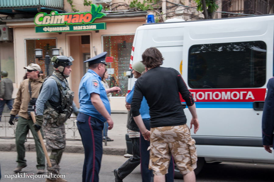 Вообще, если бы не некоторые бойцы самообороны и просто одесситы, хоть как-то пытающиеся оградить пророссийских активистов от толпы, жертв могло бы быть больше. При мне начали бить человека, защищавшего одного раненого, подумав, что он с ними заодно. В итоге тех, кто мог нормально передвигаться, грузили в милицейские автозаки, остальных сдавали врачам в скорые.