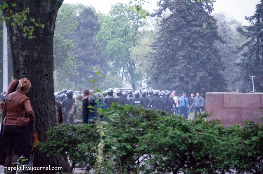 На Соборке собирают людей, чтобы идти на Куликово поле, где находится постоянный лагерь пророссийских активистов. Милиция перегруппировывается.