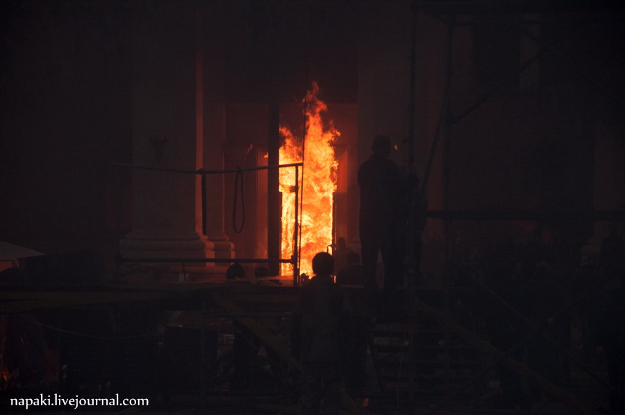 Начали работать пожарные, им помогала самооборона, вытаскивая людей из здания. Заявления о том, что пожарные начали работать поздно, на мой взгляд, оснований не имеют - идти под пули и коктейли Молотова они не должны, а милиция им условий работы обеспечить не могла. На площади люди сами тушили палатки. Качество фото низкое так как было уже темно.