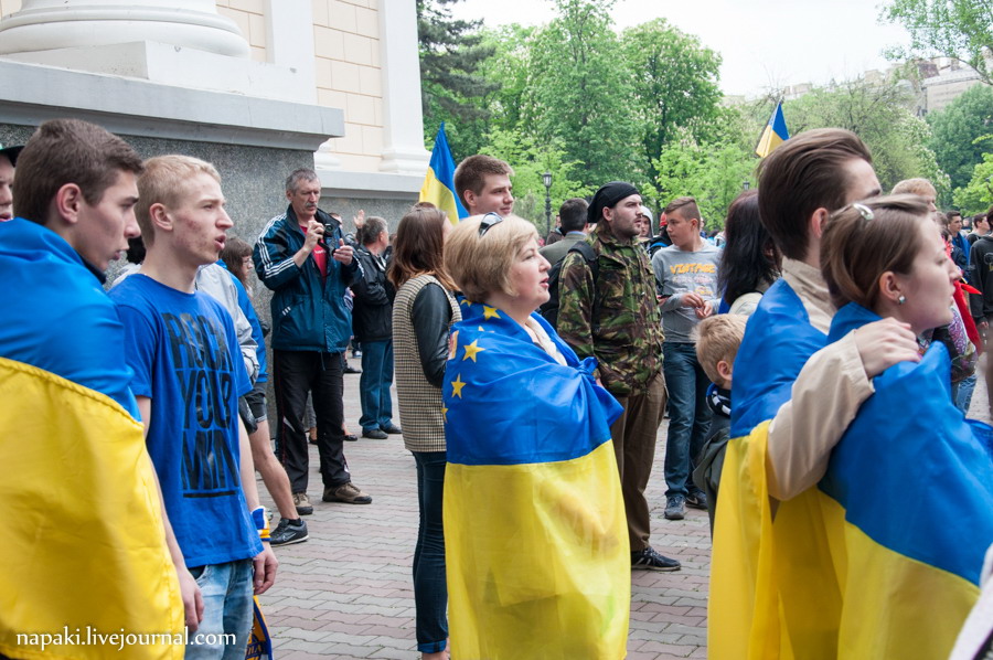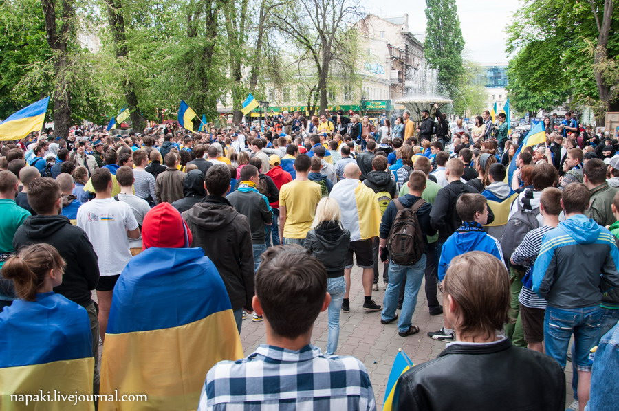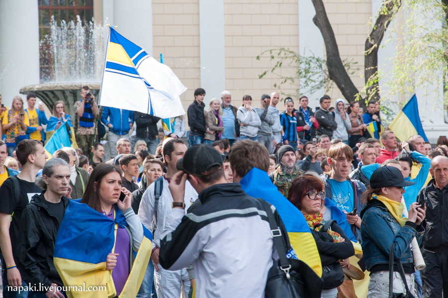 Я обошел колонну по улице Жуковского и вышел на Соборку с той стороны. В тот момент, когда я подошел к Соборке, люди пели гимн и я не увидел ни футбольных фанатов, ни "самообороны майдана", которая обычно охраняет проукраинские акции. В момент, когда я подошел, все выглядело вот так.