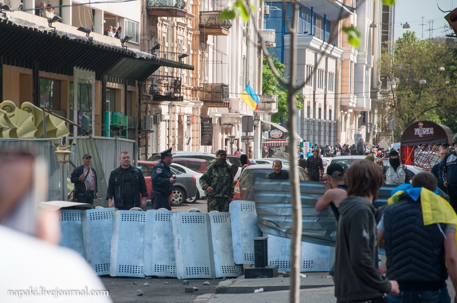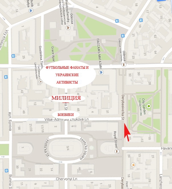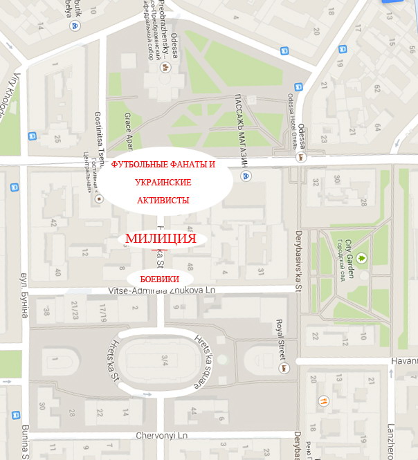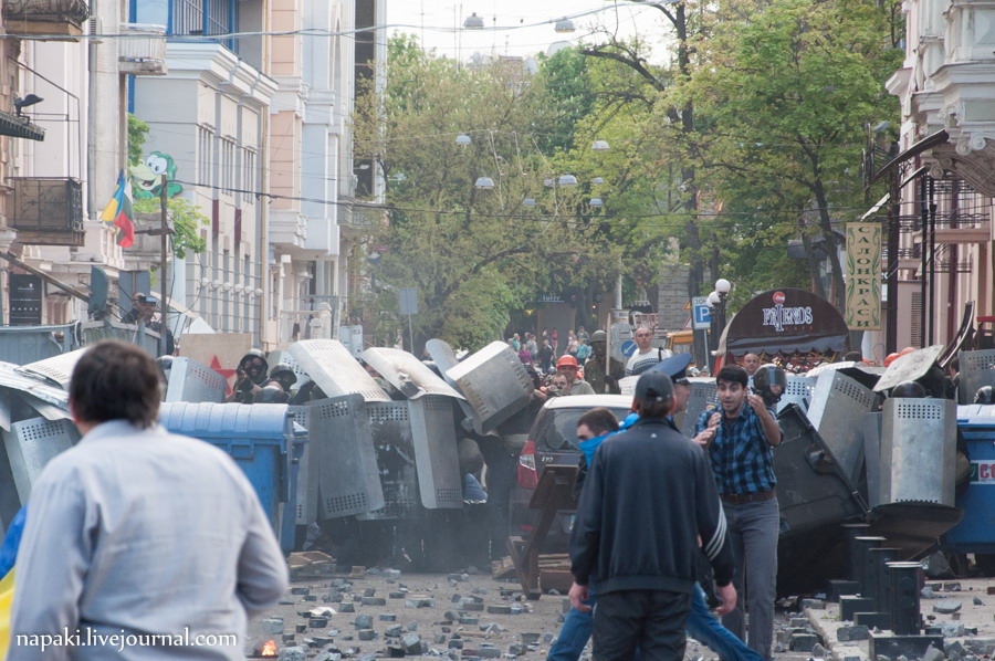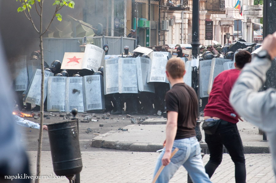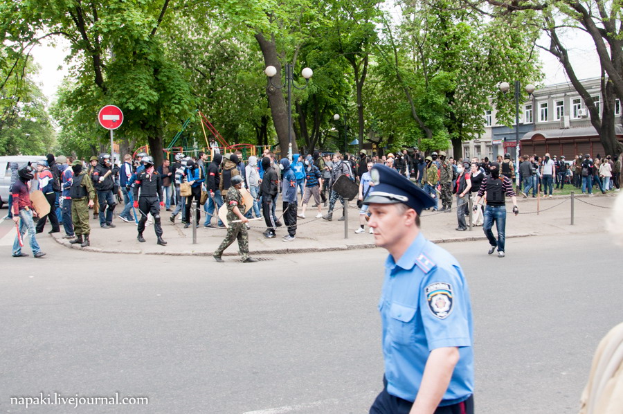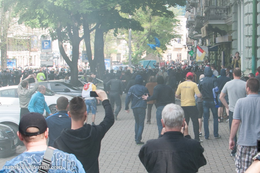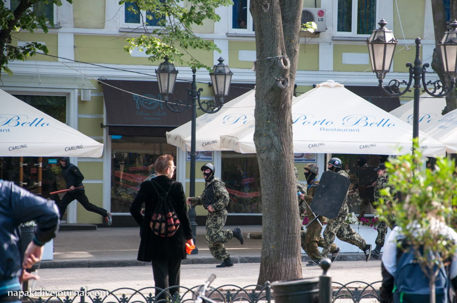На тот момент, там происходили отдельные мелкие стычки: украинские активисты, в основном футбольные фанаты, забегали в переулок, выбегали оттуда, после чего за ними выбегали российские активисты. Потом стороны менялись местами и убегали уже пророссийские бойцы. На этот момент уже были раненые, которых выводили и выносили из толчеи и передавали врачам скорой помощи. На Дерибасовской при этом была куча народа.