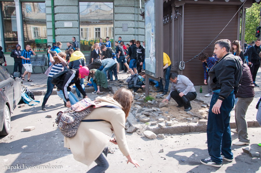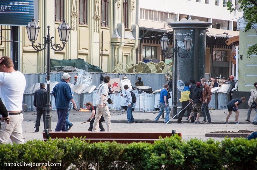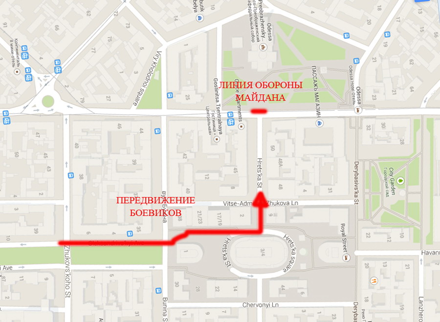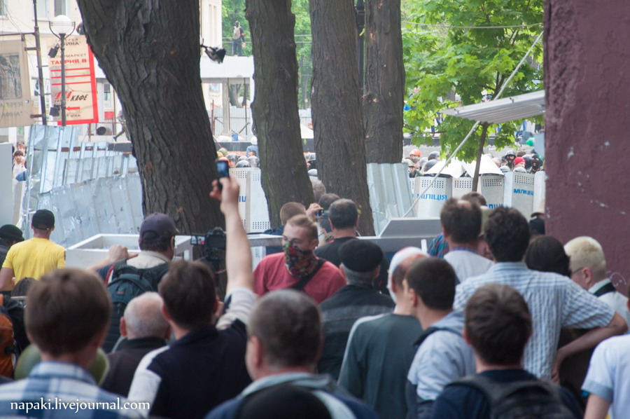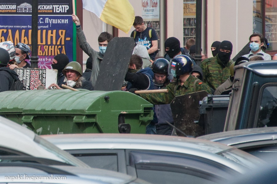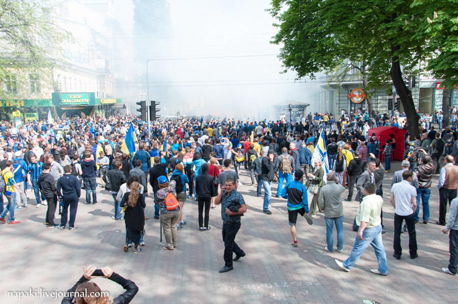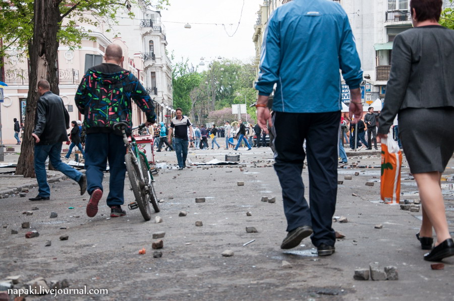 На тот момент, там происходили отдельные мелкие стычки: украинские активисты, в основном футбольные фанаты, забегали в переулок, выбегали оттуда, после чего за ними выбегали российские активисты. Потом стороны менялись местами и убегали уже пророссийские бойцы. На этот момент уже были раненые, которых выводили и выносили из толчеи и передавали врачам скорой помощи. На Дерибасовской при этом была куча народа.