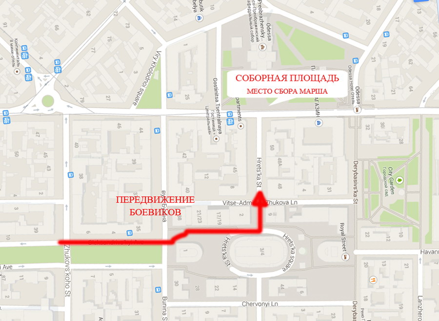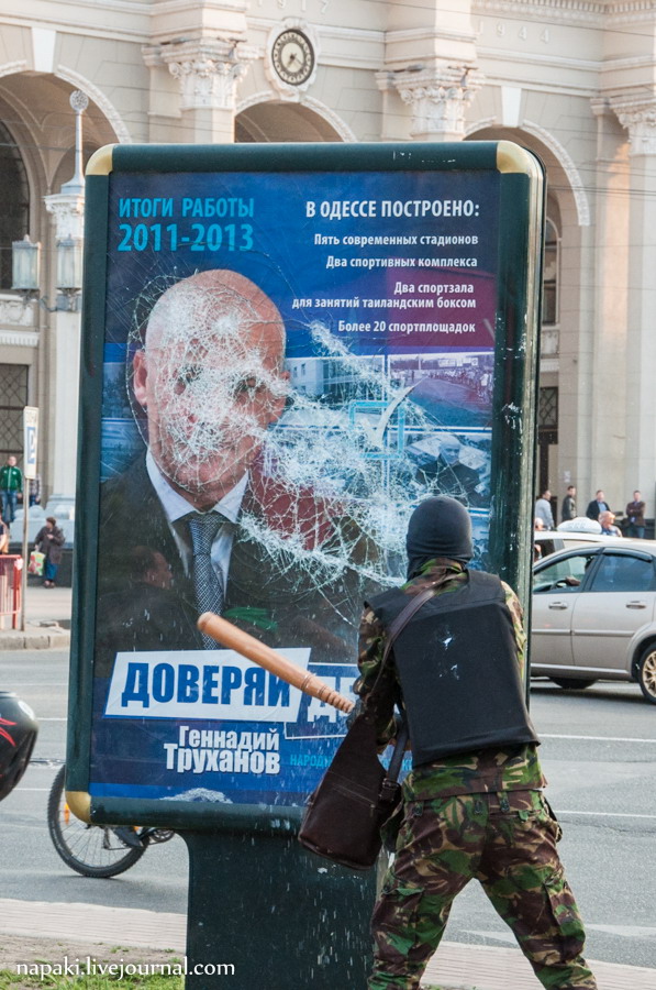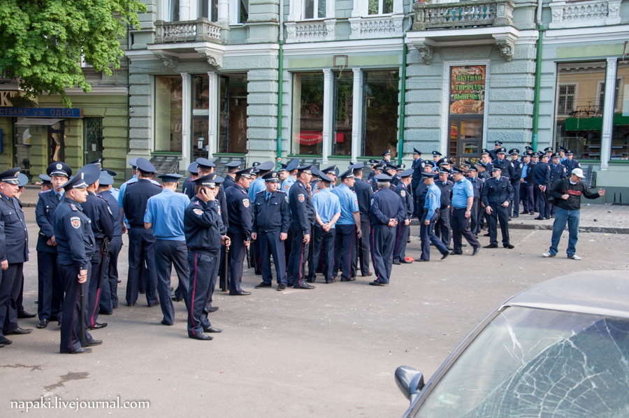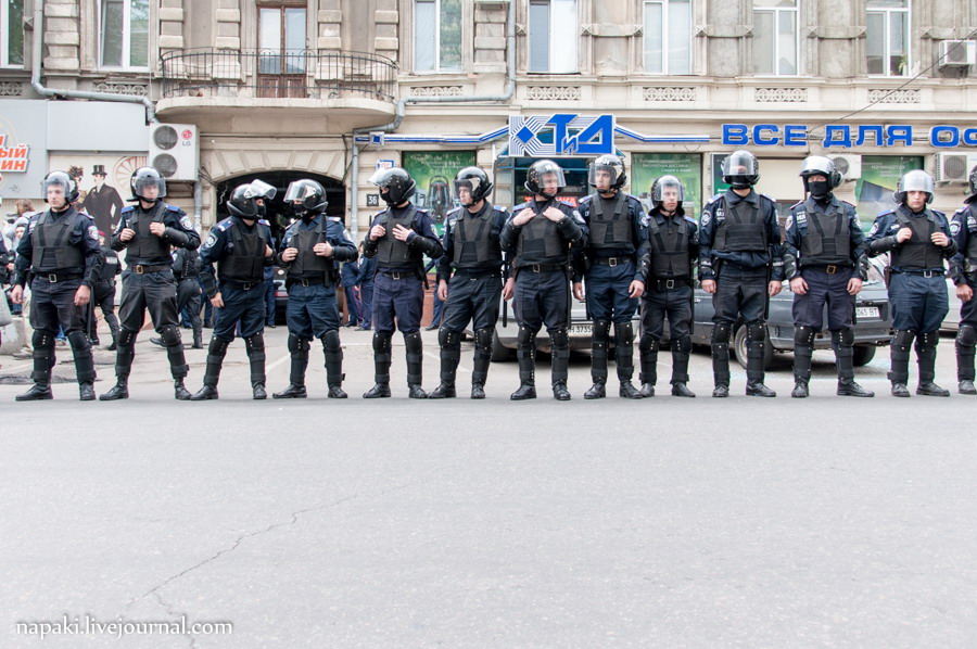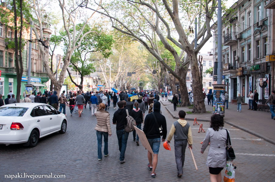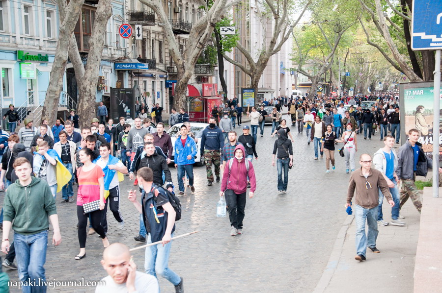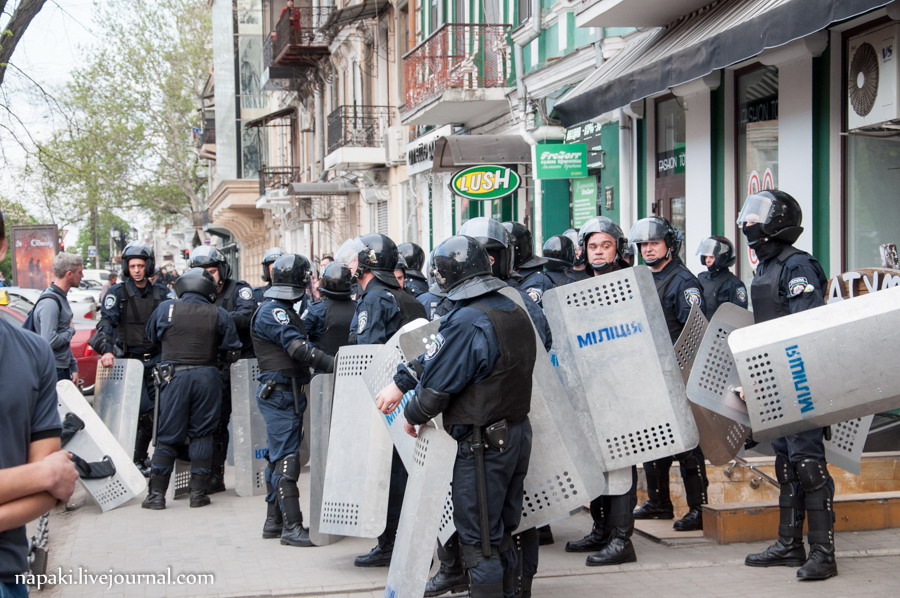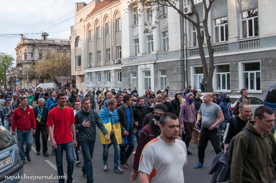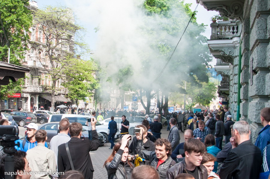 С предысторией заканчиваем, переходим к тому, что происходило 2 мая. В пятницу в Одессе должны были играть футбольные клубы Металлист (Харьков) и Черноморец (Одесса). Фанаты данных футбольных клубов анонсировали марш «За единство Украины», который должен был пройти по улицам города, после чего завершиться на стадионе Черноморец. Марш был назначен на три часа на Соборной площади (Соборка). Так как мне всегда интересно фотографировать подобные события, где-то в половину третьего я выдвинулся в сторону Соборки. До нее я не дошел, так как на углу Жуковского и Александровского проспекта наткнулся на группу вооруженных людей.