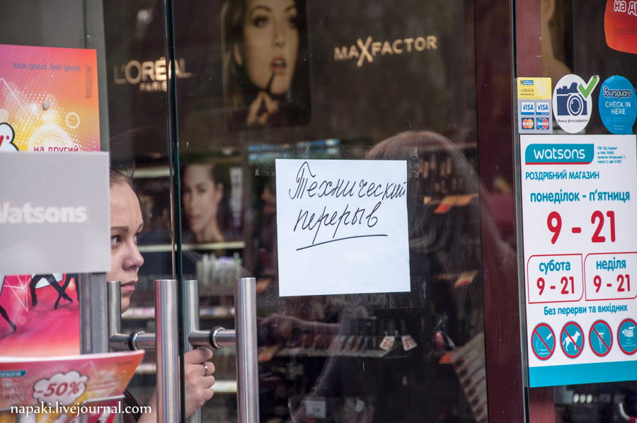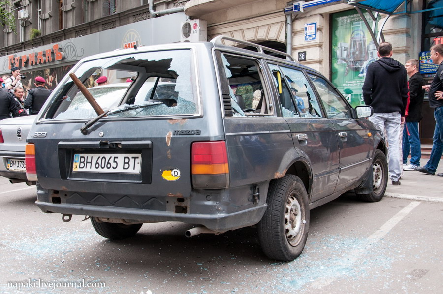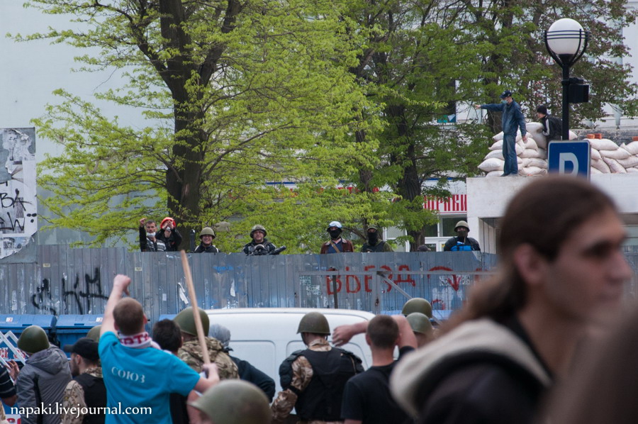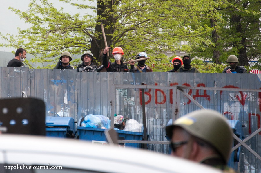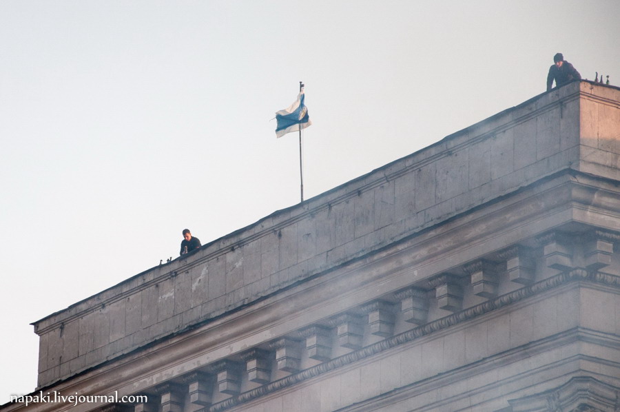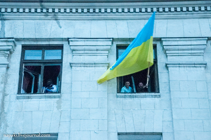 Знакомые потом рассказывали, что там находится штаб то ли «самообороны майдана», то ли «правого сектора». Вне зависимости от этого, «полная машина автоматов» боевиков не заинтересовала, поэтому попыток штурмовать подъезд не было и командиры постоянно звали людей обратно на Александровский. Попутно разнесли машину, в которой была повязана сине-желтая ленточка.