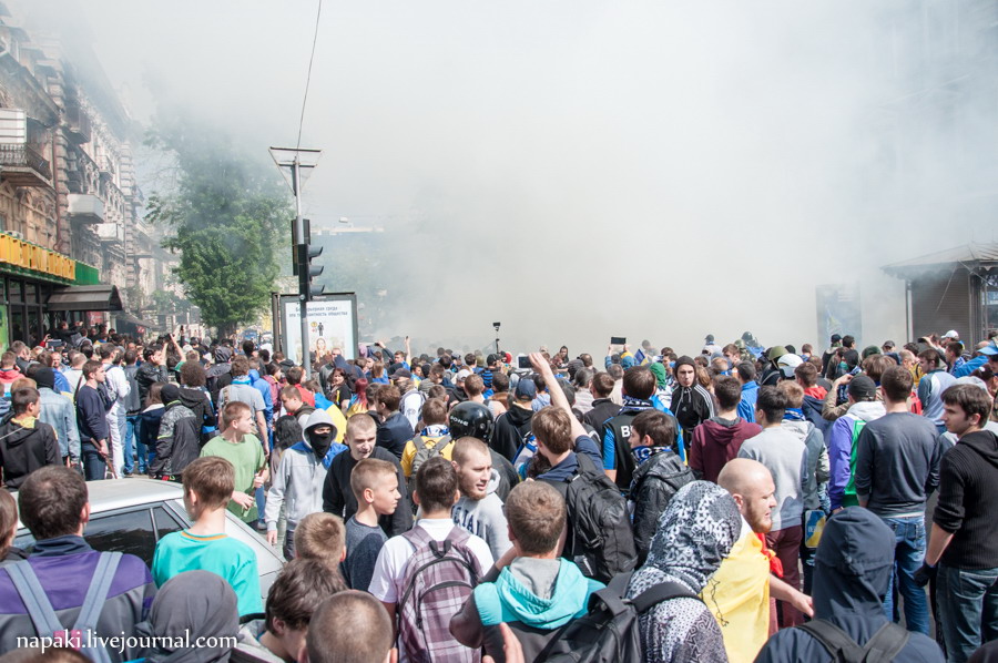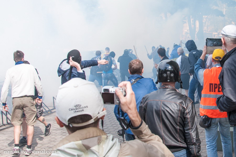 Увидев противников, к ним кинулась группа футбольных фанатов, на тот момент еще очень немногочисленная. Все происходило очень быстро, но насколько я видел, "самооборона майдана" осталась на месте, защищать площадь. Все стычки были сконцентрированы по правой стороне улицы (если смотреть с Соборной площади), так как милиции там не было.