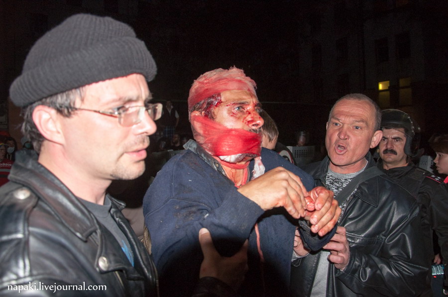 Тех, кого захватывали при штурме, выводили на улицу и собирали в кучки. Побитые, но живые. Те, кто не сопротивлялся, получали в основном тычки, а вот парня, который попытался вырваться и убежать, толпа словила и избила сильно, его отбила самооборона и унесла в скорую.