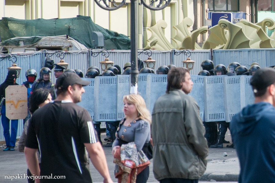 Выстроили кордон перед подъездом, хотя зачем это было нужно - непонятно, к этому времени все бойцы оттянулись обратно на Александровский проспект, после чего двинулись по Александровскому проспекту в сторону Греческой площади. Милиция делала какие-то вялые попытки им помешать, которые заключались в том, что они выстраивались через половину проспекта и их просто обходили стороной. Было видно, что у них не хватает людей и они явно не понимают, что они должны делать в этой ситуации.