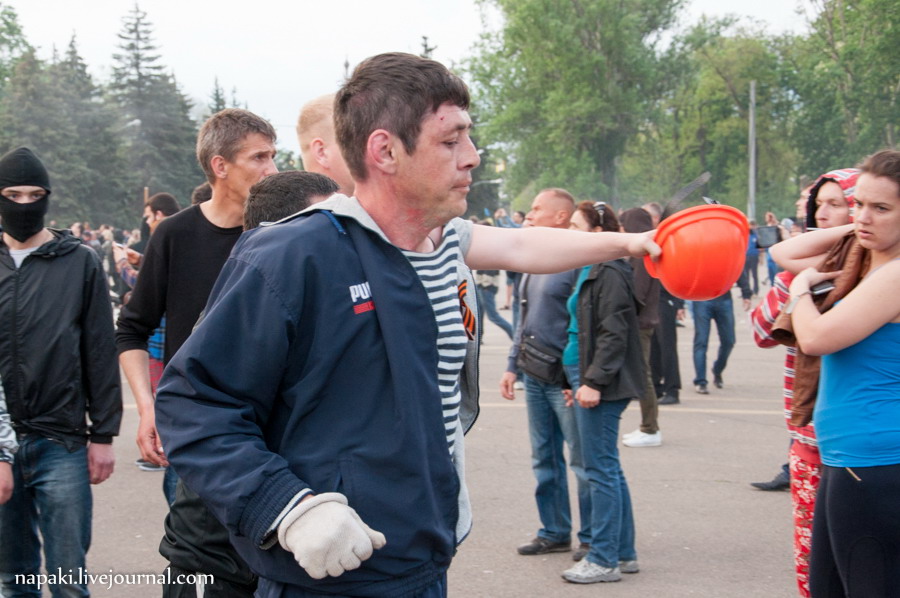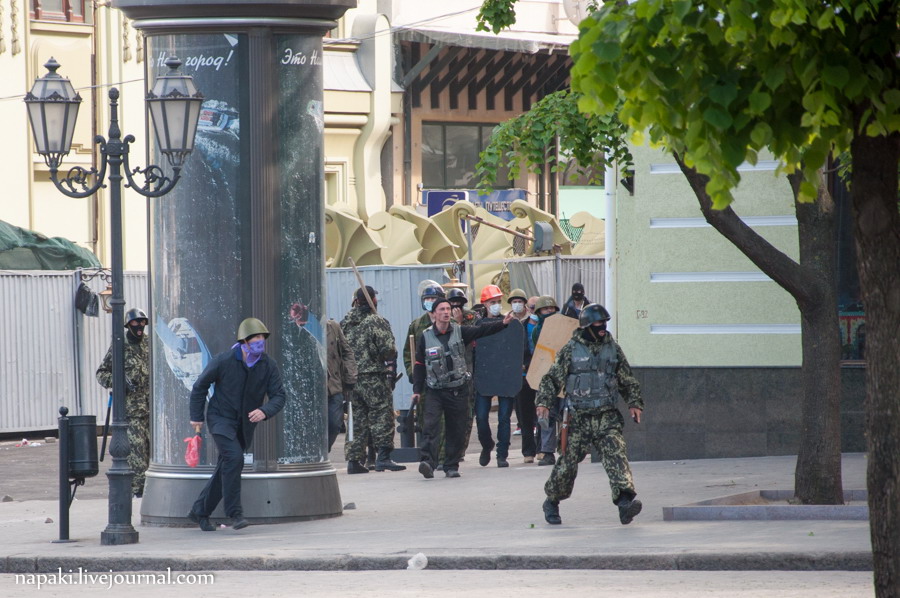 Через какое-то время большинство пророссийских боевиков выдавили с Греческой площади в сторону Соборной, после чего кто-то разбежался, а кто-то укрылся в соседних магазинах. Самооборона майдана пыталась как-то защищать избитых боевиков и тоже сдавать их в скорые, так как уровень агрессии на тот момент уже зашкалил, в толпе ходили слухи о 6 убитых, были люди с огнестрельными ранениями и с боевиками не церемонились.