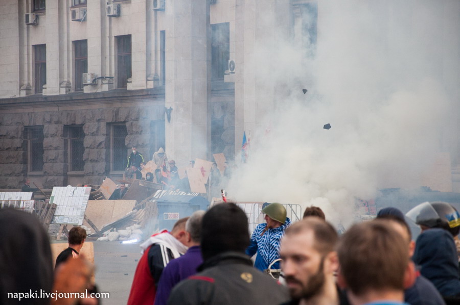 Улицу быстро заволокло дымом. В это время милиция смогла таки установить какое-то подобие кордона и создать "нейтральную полосу" шириной метров 50, а проукраинские активисты заняли часть Греческой вплоть до кордона. Самооборона тоже передвинулась вперед к кордону милиции.