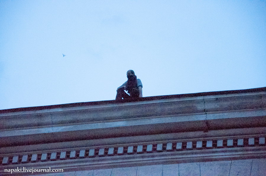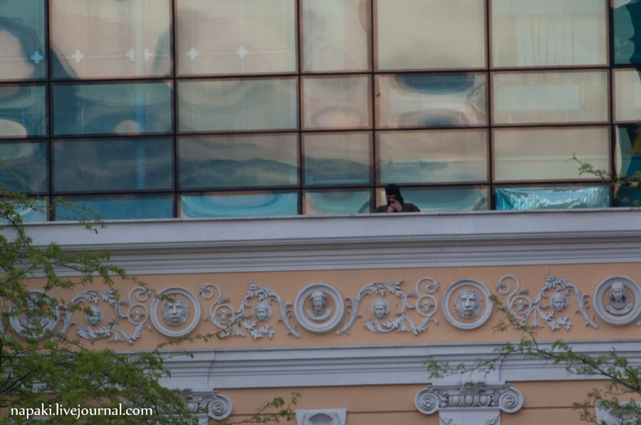 Когда я попал на Куликово поле, палатки еще стояли, пророссийские активисты обустроили баррикаду перед входом и засели за ней. В ход снова пошли дымовые шашки. На крыше здания сидят активисты с заготовленными коктейлями молотова, которые потом с крыши будут кидать вниз. Почему "командиры" данных активистов решили баррикадироваться в здании, а не уходить с площади, не ясно, так как решающие события уже произошли в центре.