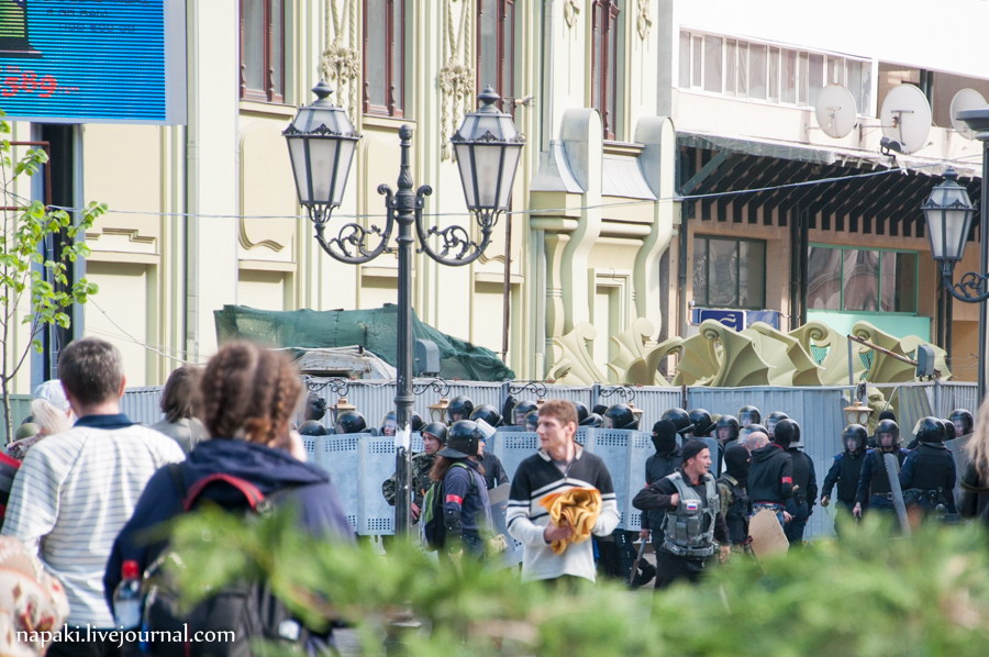Перед линией бегал кто-то из милицейского начальства и кричал, чтобы они срочно начинали марш. К этому моменту уже было понятно, что никаким маршем никуда идти не нужно, так как колонну людей просто никто не сможет защитить, поэтому никто никуда не трогался.