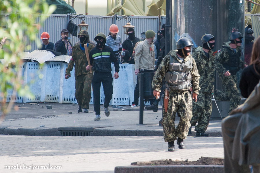 В этот момент на сцену в первый раз выходят пророссийские боевики с оружием и коктейлями Молотова.
