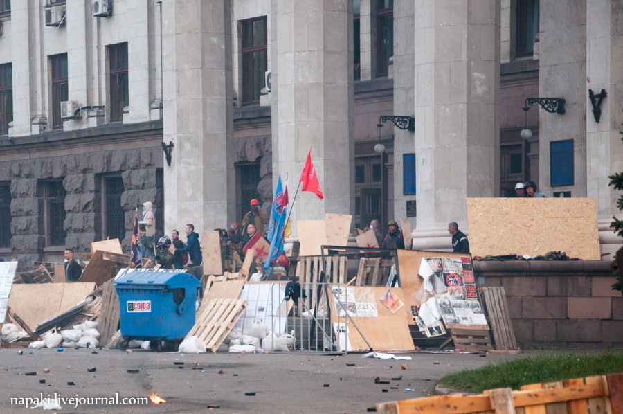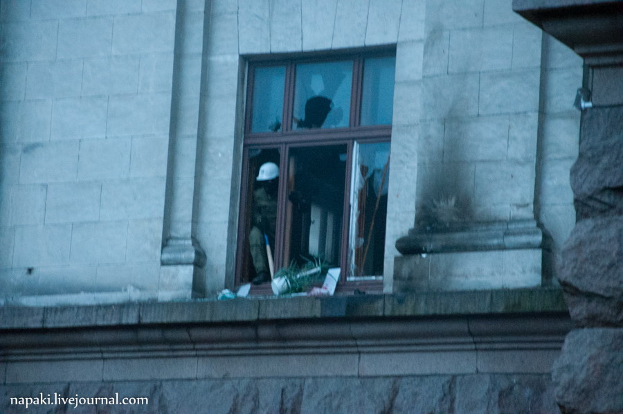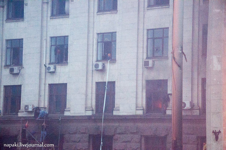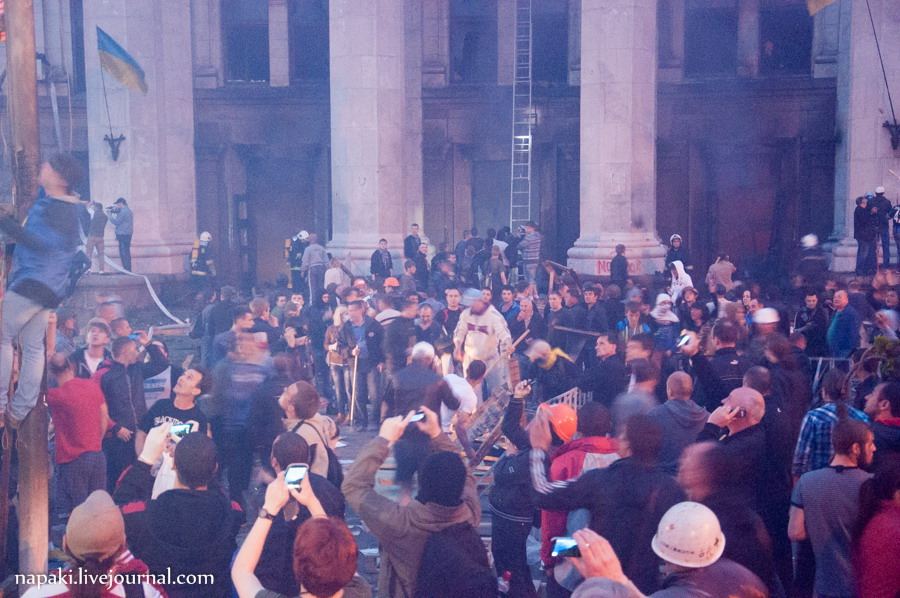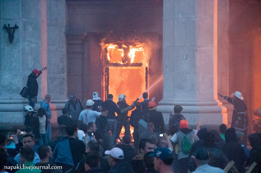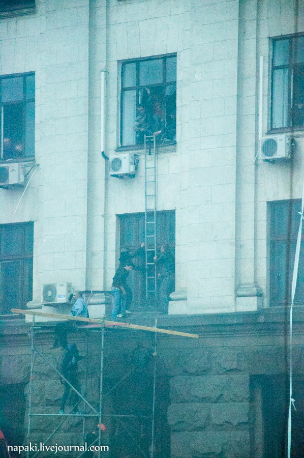 Проукраинские активисты пытаются штурмовать здание, с обеих сторон начинают лететь коктейли Молотова. Очень скоро начинается пожар в вестибюле. Так как пока это единственный пожар, в здании есть несколько выходов, в том числе и с заднего фасада, мало кто воспринимает эту ситуацию как критическую.