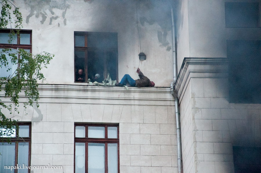 На обратной стороне здания много милиции. В окнах и на крыше люди спасаются от дыма. Несколько человек попыталось выпрыгнуть и разбилось. Человека, который выжил после прыжка, пытались как-то реанимировать до приезда скорой, потом передали врачам. При этом с крыши здания продолжают звучат лозунги про "фашистов" и "бандерлогов", раззадоривая толпу. Проукраинские активисты продолжали штурм здания, часть людей проникла внутрь.