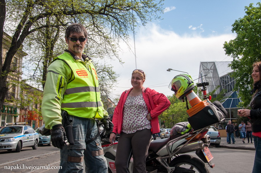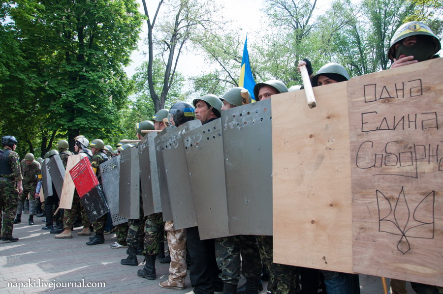 Так как по людям было видно, что они тут собрались явно на для того, чтобы "помахаться" с кем-либо, я начал искать хоть кого-то из организаторов. Нашел человека в шлеме, сказал, чтобы уводили людей, так как сюда идут вооруженные пророссийские активисты и будет просто бойня. Мне сказали, что их уже предупредили и они готовились к защите. В это время на стороне Греческой улицы действительно начала стягиваться "самооборона майдана", выстраивая линию.